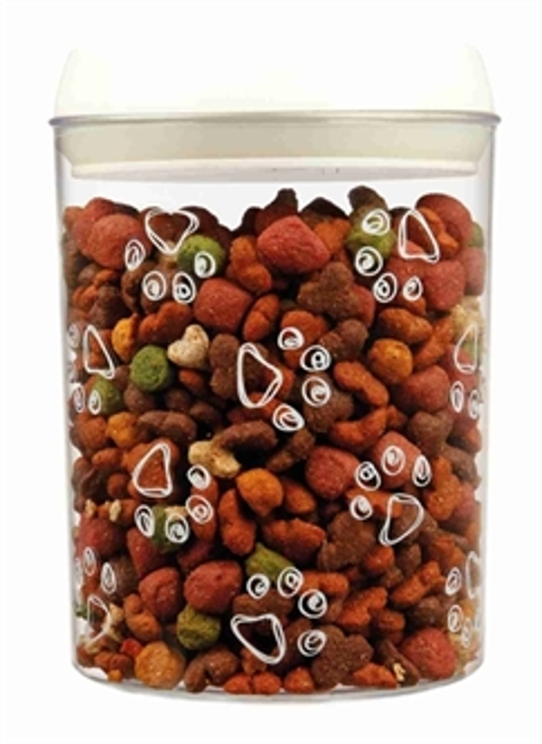De Trixie Voorraadpot Kunststof Transparant / Wit 1,5 ltr 17,5 cm is een kunststoef voerpot of snoeppot met deksel, lichtdicht afsluitbaar en ideaal voor diervoeding of snacks. In deze leuke voorraadpot blijven de snacks of brokjes van jouw huisdier extra lang vers. De pot is voorzien van een luchtdicht afsluitbaar wit deksel, dat bederf en vocht tegengaat. De pot is voorzien van een leuk motief met pooafdrukjes en transparant, zodat je altijd gelijk kunt zien hoeveel voorraad je nog hebt. Vaatwasserbestendig!