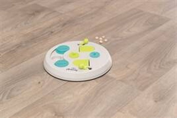 Deze braintrainer is intelligentie speelgoed voor knaagdieren. De vakken onder de plastic schijven kunnen gevuld worden met voer of lekkernijen. Het dier moet de schijven van de plek duwen om bij het voedsel te komen.