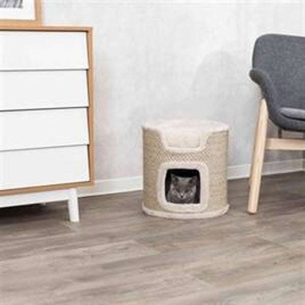 De Trixie Krabton Ria Krabpaal Lichtgrijs/Natuur van 37X37X37 cm is een ronde krabton voor de kat met sisal krabvlakken, schuilplaats, kussen en gevoerde ligplateaus. Een heerlijke eigen plek voor jouw kat hoeft niet te veel ruimte in te nemen, dat bewijst deze leuke krabton van Trixie. Krabton Ria is een compacte krabpaal voor de kat met twee verdiepingen. De ligplateaus zijn gevoerd voor meer comfort en het bijgeleverde wendbare kussen zorgt ervoor dat jouw kat heerlijk zacht kan wegdromen. De schuilplaats onderop is bekleed met lekker zacht pluche en fleece en aan de buitenkant is de ton bekleed met sisal, om jouw kat genoeg krabmogelijkheden te bieden. Krabben is een natuurlijke behoefte voor de kat, dus zorgt altijd voor voldoende mogelijkheden om te voorkomen dat jouw kat aan het meubilair begint!