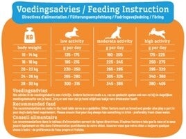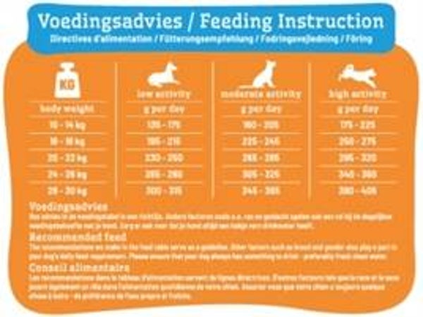 Analytische bestanddelen: Eiwit 24%, Ruwe Celstof 4%, Vetgehalte 13%, Ruwe As 6%, Calcium 1,3%, Fosfor 0,9%, Omega 3 vetzuren 0,6%, Omega 6 vetzuren 2,2%