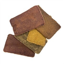 Samenstelling: Buffelhuid 49,5%, rund óf kip óf eend óf vis óf kaas 25% Kleefrijstmeel, 12,8% gelatine, gemodificeerd tapioca zetmeel, plantaardige vetten, kurkuma 1,4%