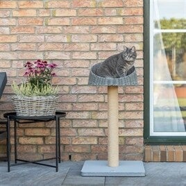 De Trixie Krabpaal Amalia Outdoor Grijs is een compact krabmeubel dat speciaal is ontworpen voor gebruik buitenshuis. Dit model combineert een stevige krabpaal met een verhoogde ligplek, waardoor je kat zowel kan krabben als comfortabel kan rusten en de omgeving kan overzien. De ligplek is uitgevoerd in polyrattan en voorzien van een licht gevoerde afwerking voor extra comfort. Dankzij de waterafstotende materialen is de krabpaal geschikt voor gebruik in de tuin of op een andere buitenplek. De jute beklede paal biedt een geschikte plek voor het onderhouden van de nagels, terwijl de stabiele bodemplaat zorgt voor een stevige basis.