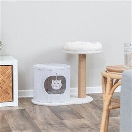 De Trixie Krabpaal Vilt Creme is een compact krabmeubel dat schuilen, rusten en krabben combineert in één ontwerp. De vilten schuilplaats biedt een beschutte plek waar je kat zich kan terugtrekken, terwijl de zachte ligplek bovenop uitnodigt om te ontspannen en de omgeving te overzien. De krabpaal is bekleed met jute, waardoor je kat een geschikte plek heeft om zijn nagels te onderhouden. In de schuilplaats ligt een omkeerbaar kussen voor extra comfort, en ook de bovenste ligplek is voorzien van een zachte afwerking.