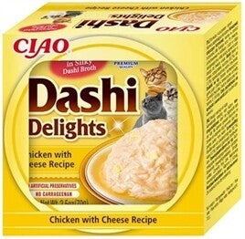 De Inaba Dashi Delights Chicken With Cheese Recipe 70 gr is aanvullend kattenvoer gemaakt met heerlijke ingrediënten van hoge kwaliteit. Katten hebben vaak de neiging om te weinig te drinken, wat tot dehydratatie kan leiden. Geef jouw kat daarom deze onweerstaanbare kattensnack van Inaba! Dit smakelijke hapje is rijk aan vocht en bestaat uit een delicate bouillon gemaakt van gedroogde, in het wild gevangen tonijn (bonitovlokken), gemengd met stukjes heerlijke kip en kaas. De verse ingrediënten zijn aangevuld met Vitamine E om het immuunsysteem te ondersteunen en groene thee-extract als natuurlijke antioxidant.