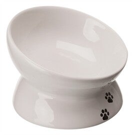 De Trixie Voerbak Kat Wit 150 ml 13 cm is een ergonomische, keramische voerbak of waterbak voor de kat. Deze bak staat verhoog, op een soort voetstuk, waardoor de kat minder ver door de poten hoeft te zakken om te eten. Dit komt de gewrichten en spijsvertering ten goede. De bak is gemaakt van keramiek en daardoor niet alleen makkelijk af te nemen, maar ook te gebruiken voor water of natvoer. De voerbak is wit met een leuke opdruk van zwarte pootafdrukjes.
